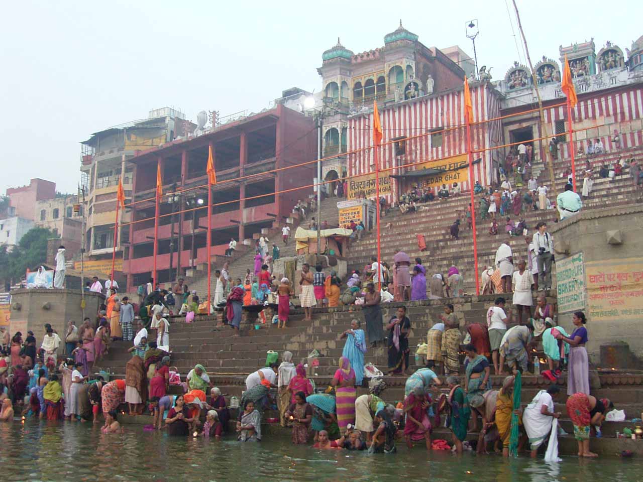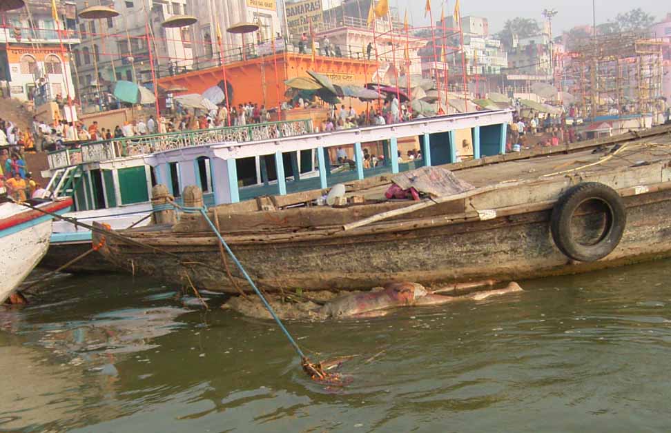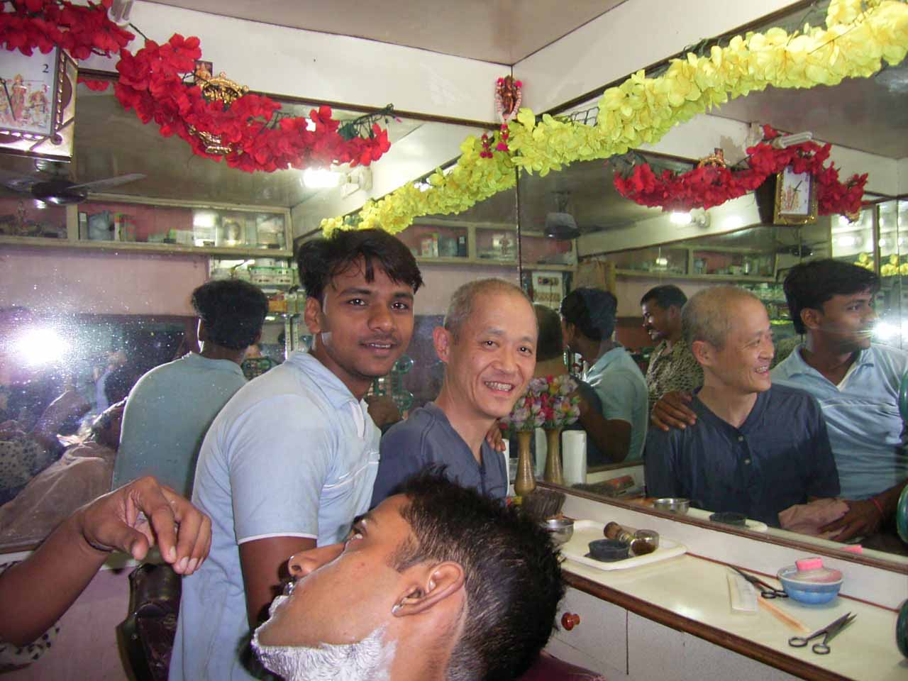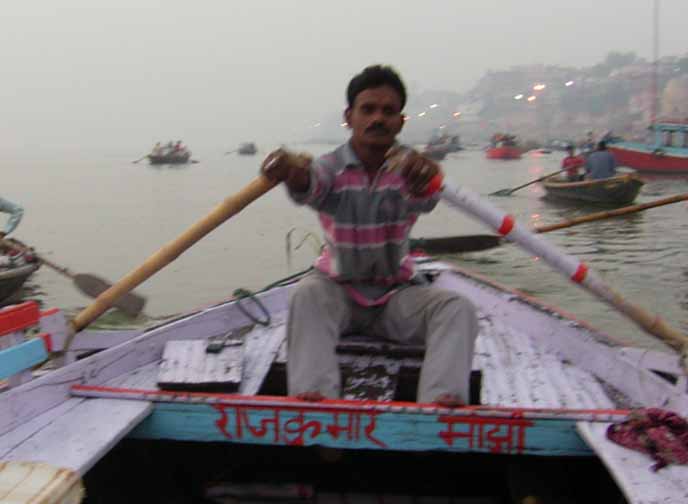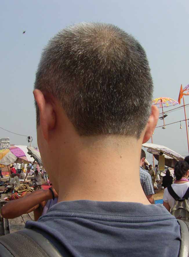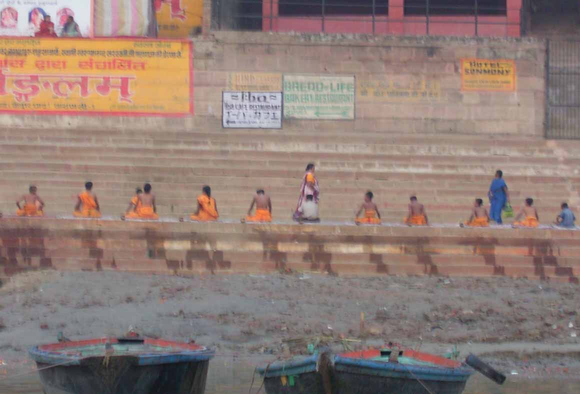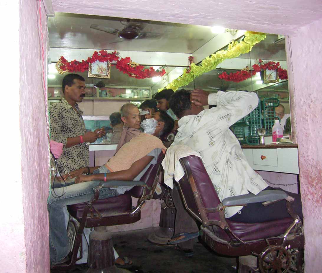 今日は、6時からボートに乗ってガンガーの沐浴を日本人4人で1時間一人50Rsで見る予定。他の二人は31歳の若い男性と若い女性1人。男性は、3週間の旅行でもうすぐ帰国。女性は、2007年の9月から世界一周。ベネズエラでバスで熟眠中に足の間に置いた荷物を全て盗まれパスポートだけ残り、大使館のないベネズエラで色々と伝を頼って一度日本に帰ったとのこと。インドへは、カトマンズから飛行機で。陸路は、インド/ネパールの国境は、いろいろと難癖をつけ、賄賂を要求されたりと大変で、バスで1日半かかるので飛行機でバラナシ入りしたとのこと。詳細は、Life goes on 三毛猫ぽちの世界くるりん旅。この後、スリランカで犬に噛まれて大変な目にあったようで...しかし、狂犬病は100%の致死率とは知らなかった...。ガードに行くと、昨日の午後とは違い多くの人が沐浴している。ボートに乗るために、岸の階段を降りるとインドおばさんに”靴を脱ぐように。”と言われる。異教徒が失礼しました。靴と靴下を脱いで、ボートへ。ガンガーの岸沿いにボートは進む。![]() ダシャーシュワメード・ガートで沐浴する人々 夕方になるとプージャーが行われる ガンガーの川岸は、真剣に沐浴している人々、洗濯をしている人、プージャーのようなことをしている人もいる。 う〜ん、なかなかすごい。これは、一度は見るべき。 ![]() ![]() 僕達のボート漕ぎ おとなしい日本人のようなインド人 20人近くを乗せて二人で漕ぐボートもいる 観光客を乗せたボートが、一杯いる。中には、20人くらい乗せて、二人で必死に漕いでいるボートもある。 ![]() ![]() ケーダール・ガートには、こんな人がいる ![]() ![]() 朝靄の向こうにガートが見える 砂州までもう少し 日の出が見える ダシャーシュワメード・ガートの次に大きい?ケーダール・ガートまで来るとボートは岸から離れ、ガートのある岸の対岸のなにもない砂州に向かう。 ここは、不浄の地らしくインド人は、行きたがらないの延髄妻が言う。全員、降りてそれぞれブラブラする。日本でこの砂州に動物の骨がある写真を見ていたので、想像していたが、意外となにもない砂州。日の出の太陽が砂州の向こう側に見える。ボート漕ぎが、水が溜まった所を指差して、日の出の写った水面と日の出を写すように促され写真を撮る。![]() ![]() ダシャーシュワメード・ガート 全景 ![]() しばらくすると、ボート漕ぎが ”火葬場に行くか?”と聞かれ、4人とも行きたいと答える。マニカルニカー・ガートの火葬場へ向かう。マニカルニカー・ガートは、ボートに乗ったダシャーシュワメード・ガートより下流にある。マニカルニカー・ガートの火葬場の火と煙と薪が見えてくる。僕が、中腰で携帯のビデオ・カメラで撮影していると、ボート漕ぎから止めるように言われる。ヒンドゥー教で死者は、この世になにも残さないことになっているらしく火葬場で写真を撮られることはタブー。写真を撮った人が、周りのインド人の怒りを買い殺されたというのを読んだ記憶あり。おかしかったのは、火葬場で二匹の犬が、交尾をして腰を振っていたこと。男性が”生と死ですね。”と言う。僕達は、ボートに乗っているのでとりあえず安全。 更に進むとスィンディヤー・ガートの水没した寺院がある。戻ることになり、ダシャーシュワメード・ガートに向かう。ボートは、進む向きによって岸沿いに漕いだり、岸から離れて漕いだりと漕ぐ場所を分けている。カオスなインドでの秩序。途中、なんと岸に停泊しているボートに死体(死体の写真ですので、見たくない人はクリックしないで下さい)がひっかかっている。ネットやTOYさんから死体が浮かんでいることは知っていたせいか、僕達は意外と驚きはなかった。これだけ普通に死体があるとバラナシでは、”ガンガー殺人事件”というような事件や小説は成立しない。ボートを降りて、1時間30分と1時間を越えていたので、ボート漕ぎが”75Rs下さい。チップも下さい。”と控えめに言うので、全員100Rs払うと嬉しそうなボート漕ぎがチャイを買ってきて僕達に振舞ってくれる。おとなしくて控えめな日本人受けするボート漕ぎ。女性が、”バラナシの道は、歩いていると50m毎に声を掛けられて最悪だった。”と言う。アフリカと南アメリカも行っている女性が最悪と言うんだから世界一最悪?”僕達は、それほどしつこく言われなかった。”と言うと男性から”二人連れだからでしょう。”と言われる。 8時前にフレンズに戻り、ボートでの観光がかなり良かったので、4人ともラジャー・パパに夜のボートを頼む。9時の朝食までゆっくり過ごす。 朝食は、洋食で薄いオムレツとトーストとチャイ。普通のレベル。 ![]() ![]() 床屋は狭く椅子は前後して3つ 僕が横を向いているのは狭いので頭の向きを変えてCUTするため 10時に水を買ってからラジャー・パパに床屋に連れて行ってもらう。フレンズのすぐ傍。すごく狭いスペースに椅子が3つあり、真ん中の椅子で客が髪