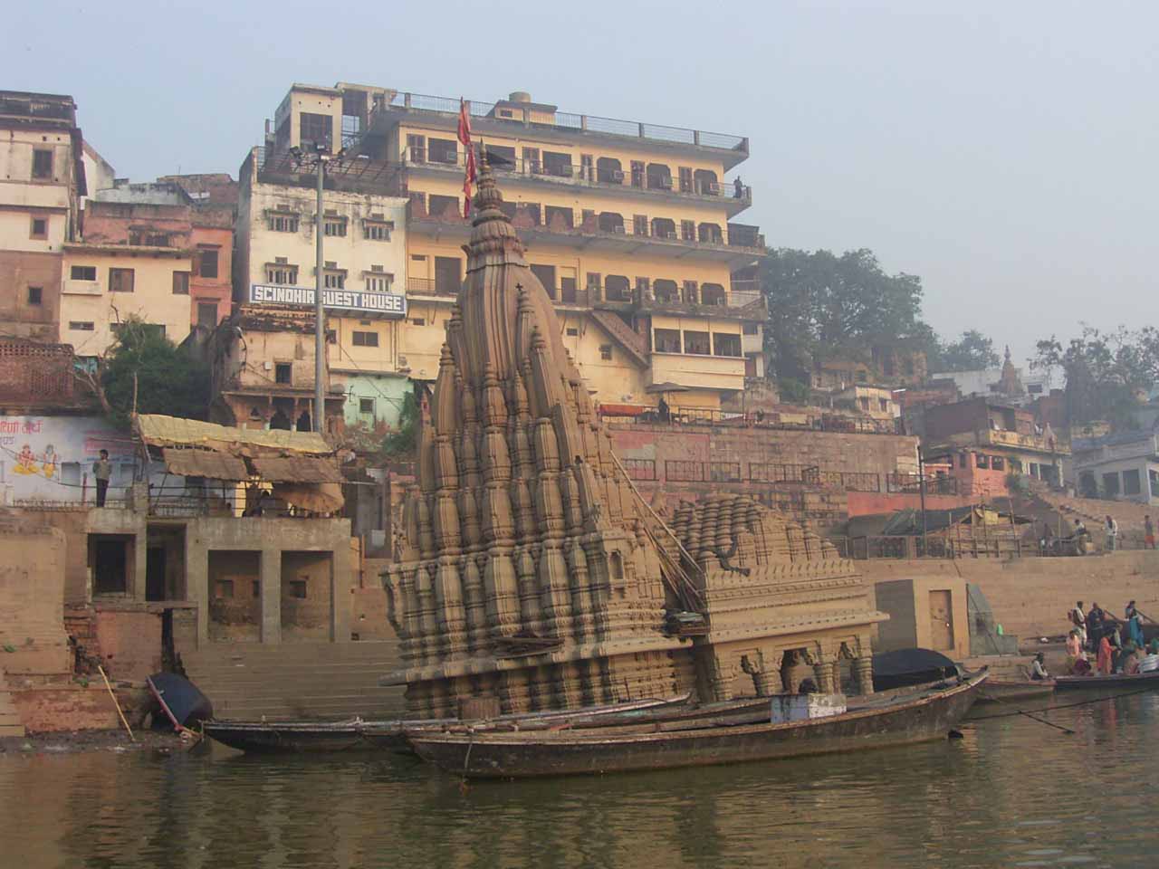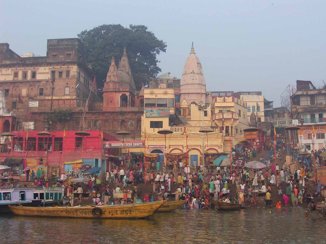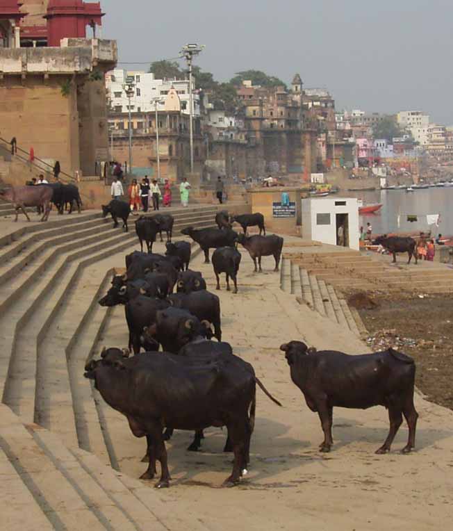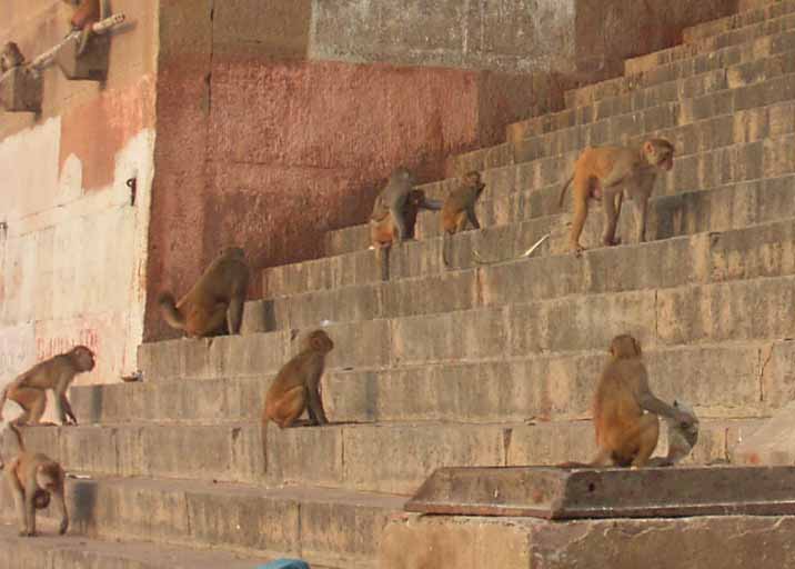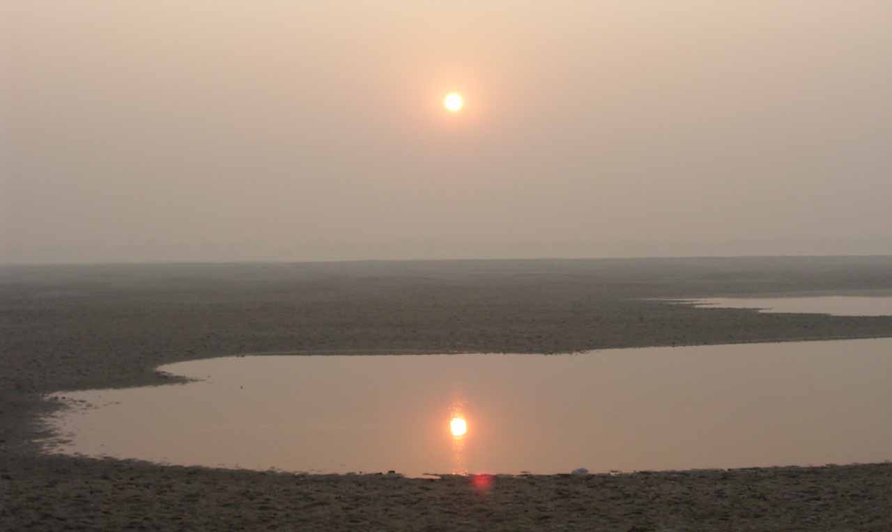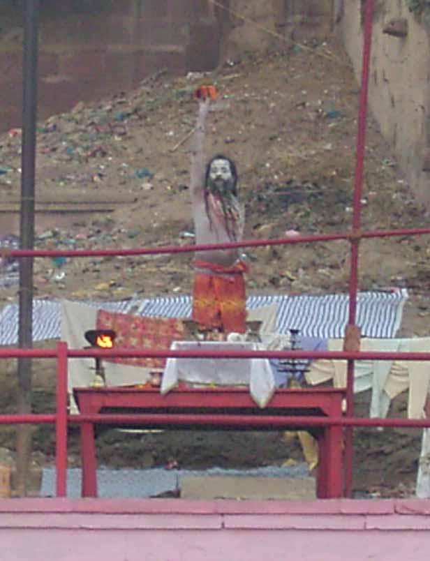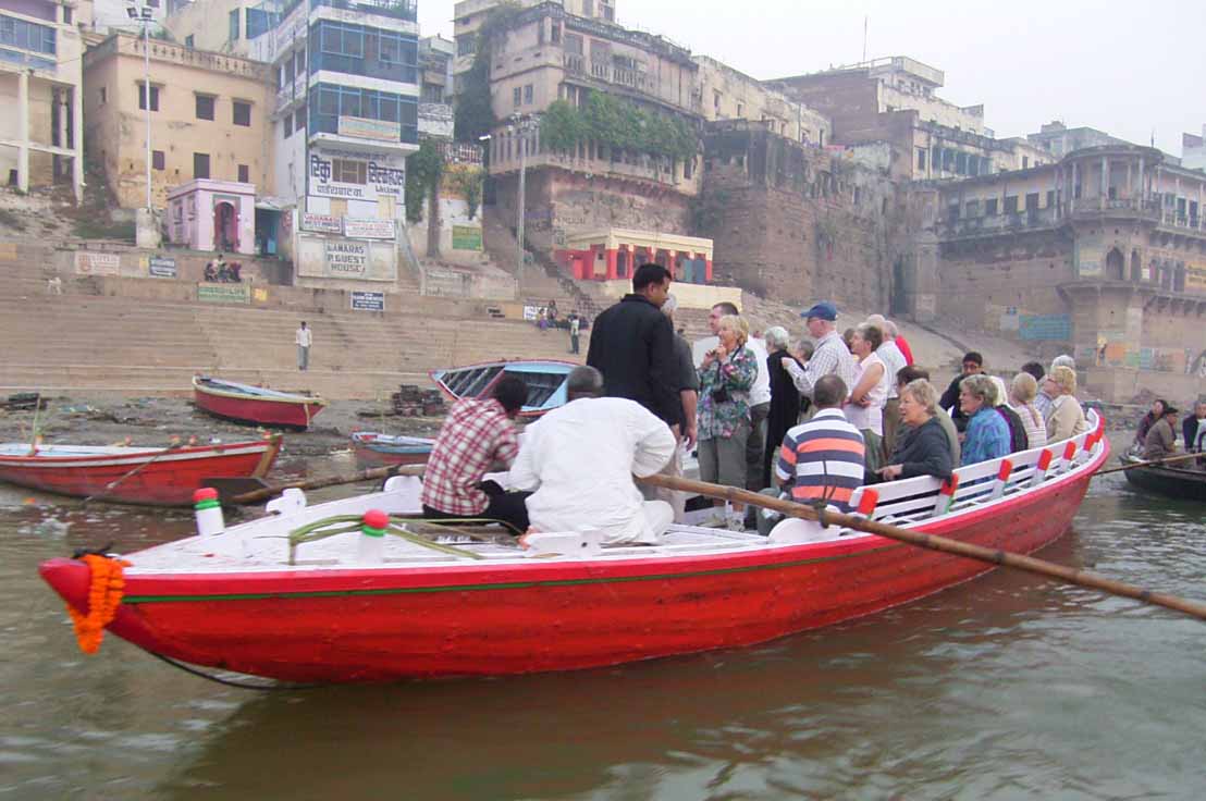 今日は、6時からボートに乗ってガンガーの沐浴を日本人4人で1時間一人50Rsで見る予定。他の二人は31歳の若い男性と若い女性1人。男性は、3週間の旅行でもうすぐ帰国。女性は、2007年の9月から世界一周。ベネズエラでバスで熟眠中に足の間に置いた荷物を全て盗まれパスポートだけ残り、大使館のないベネズエラで色々と伝を頼って一度日本に帰ったとのこと。インドへは、カトマンズから飛行機で。陸路は、インド/ネパールの国境は、いろいろと難癖をつけ、賄賂を要求されたりと大変で、バスで1日半かかるので飛行機でバラナシ入りしたとのこと。詳細は、Life goes on 三毛猫ぽちの世界くるりん旅。この後、スリランカで犬に噛まれて大変な目にあったようで...しかし、狂犬病は100%の致死率とは知らなかった...。ガードに行くと、昨日の午後とは違い多くの人が沐浴している。ボートに乗るために、岸の階段を降りるとインドおばさんに”靴を脱ぐように。”と言われる。異教徒が失礼しました。靴と靴下を脱いで、ボートへ。ガンガーの岸沿いにボートは進む。![]() ダシャーシュワメード・ガートで沐浴する人々 夕方になるとプージャーが行われる ガンガーの川岸は、真剣に沐浴している人々、洗濯をしている人、プージャーのようなことをしている人もいる。 う〜ん、なかなかすごい。これは、一度は見るべき。 ![]() ![]() 僕達のボート漕ぎ おとなしい日本人のようなインド人 20人近くを乗せて二人で漕ぐボートもいる 観光客を乗せたボートが、一杯いる。中には、20人くらい乗せて、二人で必死に漕いでいるボートもある。 ![]() ![]() ケーダール・ガートには、こんな人がいる ![]() ![]() 朝靄の向こうにガートが見える 砂州までもう少し 日の出が見える ダシャーシュワメード・ガートの次に大きい?ケーダール・ガートまで来るとボートは岸から離れ、ガートのある岸の対岸のなにもない砂州に向かう。 ここは、不浄の地らしくインド人は、行きたがらないの延髄妻が言う。全員、降りてそれぞれブラブラする。日本でこの砂州に動物の骨がある写真を見ていたので、想像していたが、意外となにもない砂州。日の出の太陽が砂州の向こう側に見える。ボート漕ぎが、水が溜まった所を指差して、日の出の写った水面と日の出を写すように促され写真を撮る。![]() ![]() ダシャーシュワメード・ガート 全景 ![]() しばらくすると、ボート漕ぎが ”火葬場に行くか?”と聞かれ、4人とも行きたいと答える。マニカルニカー・ガートの火葬場へ向かう。マニカルニカー・ガートは、ボートに乗ったダシャーシュワメード・ガートより下流にある。マニカルニカー・ガートの火葬場の火と煙と薪が見えてくる。僕が、中腰で携帯のビデオ・カメラで撮影していると、ボート漕ぎから止めるように言われる。ヒンドゥー教で死者は、この世になにも残さないことになっているらしく火葬場で写真を撮られることはタブー。写真を撮った人が、周りのインド人の怒りを買い殺されたというのを読んだ記憶あり。おかしかったのは、火葬場で二匹の犬が、交尾をして腰を振っていたこと。男性が”生と死ですね。”と言う。僕達は、ボートに乗っているのでとりあえず安全。 更に進むとスィンディヤー・ガートの水没した寺院がある。戻ることになり、ダシャーシュワメード・ガートに向かう。ボートは、進む向きによって岸沿いに漕いだり、岸から離れて漕いだりと漕ぐ場所を分けている。カオスなインドでの秩序。途中、なんと岸に停泊しているボートに死体(死体の写真ですので、見たくない人はクリックしないで下さい)がひっかかっている。ネットやTOYさんから死体が浮かんでいることは知っていたせいか、僕達は意外と驚きはなかった。これだけ普通に死体があるとバラナシでは、”ガンガー殺人事件”というような事件や小説は成立しない。ボートを降りて、1時間30分と1時間を越えていたので、ボート漕ぎが”75Rs下さい。チップも下さい。”と控えめに言うので、全員100Rs払うと嬉しそうなボート漕ぎがチャイを買ってきて僕達に振舞ってくれる。おとなしくて控えめな日本人受けするボート漕ぎ。女性が、”バラナシの道は、歩いていると50m毎に声を掛けられて最悪だった。”と言う。アフリカと南アメリカも行っている女性が最悪と言うんだから世界一最悪?”僕達は、それほどしつこく言われなかった。”と言うと男性から”二人連れだからでしょう。”と言われる。 8時前にフレンズに戻り、ボートでの観光がかなり良かったので、4人ともラジャー・パパに夜のボートを頼む。9時の朝食までゆっくり過ごす。 朝食は、洋食で薄いオムレツとトーストとチャイ。普通のレベル。 ![]() ![]() 床屋は狭く椅子は前後して3つ 僕が横を向いているのは狭いので頭の向きを変えてCUTするため 10時に水を買ってからラジャー・パパに床屋に連れて行ってもらう。フレンズのすぐ傍。すごく狭いスペースに椅子が3つあり、真ん中の椅子で客が髪