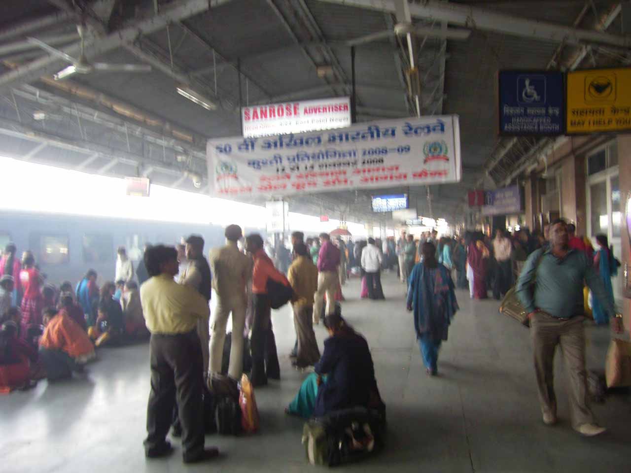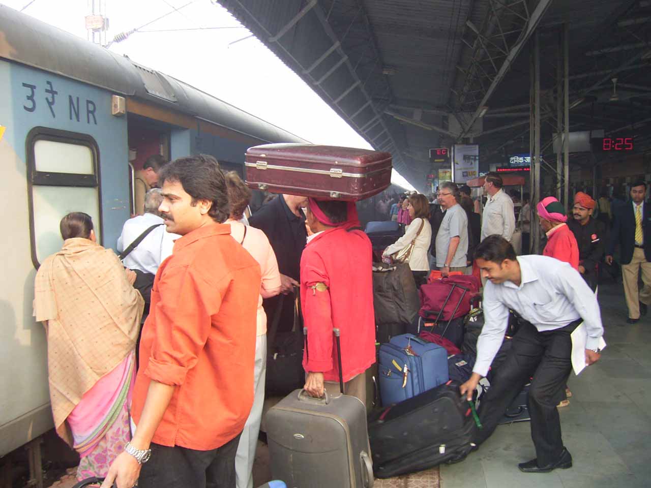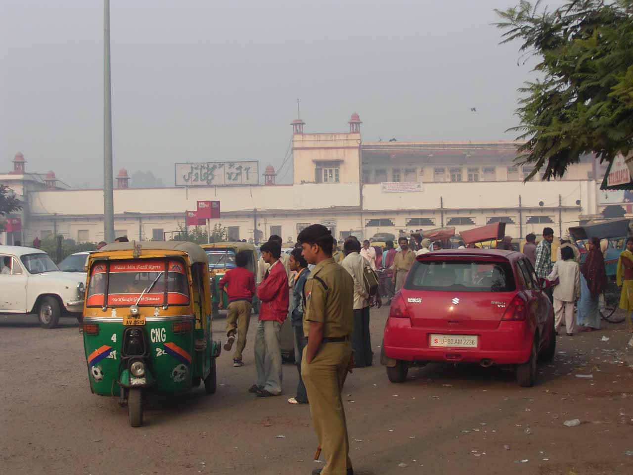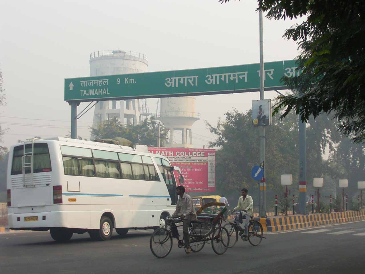 ホテルを出る。外は、まだ暗くて、店も屋台も無く人通りも少ないので駅への曲がり道を少し迷う。危険な感じは無い。![]() ![]() 1番ホーム しゃがんで歩く足の不自由な物乞いにびっくりした Train No 2002 BHOPAL SHTBDI デリー駅に無事到着。列車のホームは、ラジェンダさんが言っていたように1番ホーム。列車は、まだ来ない。駅は、撮影禁止のはずだが欧米人がバシバシとフラッシュを焚いて撮っているので、僕もカメラを取り出す。僕達のCoarchはE1だが、ホームの電光表示は"C"しかないのでホームの端まで行って探すが"E"は無い。延髄妻が”StationManeger”という表札の部屋に突撃し、恐らく副駅長に"E1のCoarchはどこですか?”と聞くと右に行くように言われる。駅の壁に貼ってある予約表のE1には僕達二人の名前があり、一安心。右に行くとアメリカとイタリアの団体客がいる。 ![]() ![]() 列車が到着。E1のCoarchにも、予約表が貼ってあり、名前あり。乗り込むと進行方向とは逆向きの座席。06:15発車...と思ったらすぐに停まり、06:20に再発車。延髄妻が”シートベルトは無いの?”と聞く。う〜ん、今までいろいろな国で電車に乗って一度もシートベルトのある電車はなかったのに...電車にシートベルトですか? ![]() ![]() 赤いターバンを巻いた征服姿の男性アテンダント二人が英字新聞を配り、その後列車には載せたがまだ入り口に置いたままのイタリア団体客の大きな荷物を空いている網棚にどんどん載せていく。しばらくすると、お湯の入った小さな魔法瓶とティーバッグ 2個とティー・カップとビスケットをサーブ。延髄妻は、ビスケットを見て”これがベジのブレック・ファーストかな?”と思ったらしい。バカか!お前は。今度は、500mlの水と紙コップがサーブ。 ![]() ![]() そして今度は朝食として、ミルク、コーンフレーク、薄い食パン 2枚、バター、ジャム、クロワッサンもどき(形はそうだが硬い)、揚げ物、バナナとお腹一杯になる。ここまでは、器を除菌シートで拭いていたが最後にジュースが出てきて、そのまま飲んでしまう。食事が終わり、トレイにティー・バッグを載せてサーブしに来るがそこには50Rsのお札があり、完全にチップを要求してくる。今までは、ディスポーザル手袋を付けてキビキビとサーブしていて好印象だったのに...仕方なく20Rs載せる。チップを払ったので、カメラで僕達を撮ってもらうがフラッシュを焚かなかったのでボケボケ。 ![]() ![]() 08:15 アーグラー着。出口には、団体客の大きなバッグがあり、すぐに出られない。アテンダントが荷物を降ろしているのにその間隙を突いて乗り込んで来るインド人。車内は降りる客が列を作っているので入れないし、座席指定なので急いで乗り込んでも一緒なのに...何故? ありエネー!仕方なく僕達も荷降ろしの間隙を縫って降りる。延髄妻が、バラナシで一緒だった男性から”アーグラーは最悪”という情報をINPUTされているため、駅を降りたらビビリまくりで、一刻も早く駅周辺から離れたいらしく、僕が写真を撮っていると”写真なんか撮ってないで早く行こうーッ!”と怒る延髄妻。 ![]() ![]() 奥の白い建物がAGRA CANTT駅 リキシャ,タクシーがいる 駅から少し歩くと店がある 駅構内を出ると、リキシャの運転手からの勧誘の声が襲いかかる。それほどしつこい勧誘ではないが、こういうのが嫌で嫌でしょうがない延髄妻は一刻も早く逃げ出したくて”あの外人の団体客の後を付いて行く。”と言う。付いて行っても、団体客はバスに乗っていなくなり、僕達は取り残されるだけなので、しばらく付いて行って勧誘のいなくなったところでタージ・マハル行きではなく、タージ・マハルから駅に戻る向きの道路の右側を歩く。この側なら、待ち構えている勧誘はいないはず。 ![]() ![]() タージ・マハルまで9kmの表示 牛車が3車線の真ん中を行く アーグラー・カント駅から、タージ・マハルまでは”地球の歩き方”の地図を見ると5kmくらいなので、歩いて1時間強で辿り着けるはずだし、道路標示もこんな感じで信じられないらしいという情報を元に歩いて向かう僕達。しかし、ここで驚異のストーカー・サイクル・リキシャが現れる。”タージ・マハルは、遠いから歩いては行けない。"とかいろいろと話し掛けてくるが無視する僕達。僕達は、車が来る方向とは逆向きで車道の脇を歩いているので、僕達に付いて来るリキシャは完全に進行方向とは逆に進んでいるが、そんなことはお構いなしに付かず離れずで話掛けて無視されると、距離を置いて付いて来たりとものすごいしつこさ。途中、タージ・マハルまでの距離の道路標示を撮っていると延髄妻が”写真ばっかり撮ってないで早く行ってヨ!”とキレて一人だけ早足で先に行ってしまう延髄妻。そして、その光景をサイクル・リキシャは見た!しばらくは、延髄妻とは距離を離れて歩いて行く。リキシャは、30分くらい付いて来たがさすがに諦めていなくなる。しつこければ、成功する訳ではなく状況判断が重要なんで
